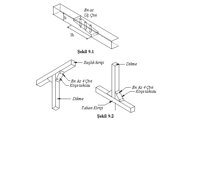 olabildiğince kaçınılmalıdır. 9.3. TAŢIYICI DUVARLAR 9.3.1. Duvar Taşıyıcı İskeleti 9.3.1.1 - Taşıyıcı duvarların ahşap iskeleti aşağıdaki elemanlardan oluşturulacaktır: (a) En fazla 1.5 m ara ile konulacak dikmeler, (b) Dikmelerin altına konulacak taban kiriţleri, (c) Dikmelerin üstüne konulacak başlık kirişleri, (d) Dikmeleri duvar boyunca birbirine bağlayarak taban ve başlık kirişleri ile birlikte duvarda dikdörtgen gözler oluşturan yatay ara kiriţler, (e) Oluţturulan dikdörtgen gözleri üçgen gözlere bölen çaprazlar. 9.3.1.2 - Tek katı ahşap olan binalarda dikmeler, taban ve başlık kirişleri ile çaprazların enkesit boyutları en az 10 cm x 10 cm, ara kirişlerin enkesit boyutları ise en az 5 cm x 10 cm olacaktır. 9.3.1.3 - Her iki katı da ahşap olan binalarda dikmeler, taban ve başlık kirişleri ile çaprazların enkesit boyutları en az 12 cm x 12 cm, ara kirişlerin enkesit boyutları ise en az 6 cm x 12 cm olacaktır. 9.3.1.4 - Dikmeler ve çaprazlar tek parçalı olacaktır. Taban kirişleri ile başlık kirişlerinde ise ek yapılabilir. Ancak ekler eğri göğüslü bindirme şeklinde yapılacak, cıvata ya da kiriş kalınlığına eşit boydaki çivilerle bağlanacaktır (Sekil 9.1). 9.3.1.5 - Dikmeler ve çaprazlar, taban kirişine ve başlık kirişine geçmeli olarak birleştirilecek ve ayrıca çivi ile pekiştirilecektir. Geçmeli birleşim yapılmaması durumunda, çivili köşe takozları kullanılacaktır (Sekil 9.2). 9.3.1.6 - Diğer eleman bağlantıları, düz ya da eğri göğüslü zıvana şeklinde yapılacaktır. 9.3.2. Taşıyıcı Duvarların Minimum Toplam Uzunluğu Planda birbirine dik doğrultuların her biri boyunca uzanan ahşap taşıyıcı duvarların, pencere ve kapı boşlukları hariç olmak üzere, toplam uzunluğunun brüt kat alanına (konsol döşemeler hariç) oranı (0.20 I) m/m2 ’den daha az olmayacaktır. Burada I, Bölüm 6’da tanımlanan Bina Önem Katsayısıdır. 9.3.3. Taşıyıcı Duvarların Maksimum Mesnetlenmemiş Uzunluğu Herhangi bir taşıyıcı duvarın, planda kendisine dik olarak saplanan taşıyıcı duvar eksenleri arasında kalan mesnetlenmemiş uzunluğu, 4.5 m'yi geçmeyecektir. Aksi durumda dikmeler, en fazla 4.5 m ara ile döşeme kirişlerine veya çatı makaslarına çapraz elemanlarla bağlanacaktır (Sekil 9.3). 9.3.4. Taşıyıcı Duvar Boşlukları 9.3.4.1 - Bina köţesine en yakýn pencere veya kapı boşluğu ile bina köşesi arasında bırakılacak dolu duvar parçasının plandaki uzunluğu 1.5 m’den az olmayacaktır. 9.3.4.2 - Bina köşeleri dışında, pencere ve kapı boşlukları arasında kalan dolu duvar parçalarının plandaki uzunluğu 0.75 m’den az olmayacaktır. 9.3.5. Lentolar ve Hatıllar 9.3.5.1 - Zemin katı yığma kargir olan binaların hatıl ve lentoları Bölüm 10’da verilen kurallara göre yapılacaktır. 9.3.5.2 - Ahşap taşıyıcı duvarlarda kapı üstü lentoları ile pencerelerin alt ve üst lentoları, dikmelerin enkesitinde olacak ve lentoların dikmelere birleşimi geçmeli olarak yapılacaktır. 9.3.6. Duvar Dolgusu ve Kaplaması 9.3.6.1 - Yukarıdaki 9.3.1.1’e göre ahşap taşıyıcı duvarlarda oluşturulan üçgen gözler; hafif tuğla, kerpiç, ahşap yonga veya uygun izolasyon maddeleri ile doldurulacaktır. 9.3.6.2 -