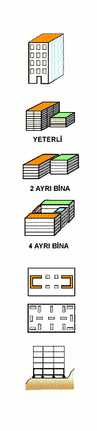 Restoran, toplantı salonu, mağaza gibi nedenlerle giriş katında dolgu duvarları kaldırılmış olan binalarda yıkılmalar bu gibi giriş katlarında olur. Böyle zayıflatılmış katlara yumuşak kat (tehlikeli kat) denir. Birbirine komşu iki bina arasında yeterli aralık bırakılmazsa, deprem titreşimleri sırasında iki bina birbirine çarparak beklenmedik hasarlara meydana verebilir. Yatay düzlemde L, T, U ve kare tipi bir mimari plan gerektiren binalarda burulma hasarlarını önlemek için bina gerektiği sayıda dikdörtgen sayıda planlı parçalara ayrılmalı. Planda kolon ve perdeler dengeli ve burulmayı oluşturmayacak biçimde düzenlenmeli. Planda kolonlar güçlü ve boyutları her iki doğrultuda da dengeli bir biçimde dağıtılmalı. Eğimli arazide olsa bile temeller aynı yükseklikte inşa edilmeli. Bu gibi durumlarda güvenceyi sağlamak için bazı boşluklarda yeterince betonarme perde duvarı inşa edilmeli, tüm kolonlar yıkılmayı önleyecek yeterlikte boyutlandırılmalı ve tüm kat yüksekliği boyunca enine donatılarla sarılmalı. |